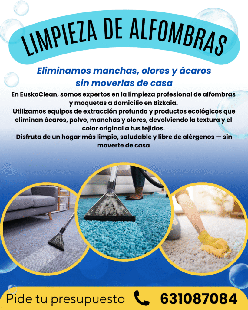 Las alfombras y moquetas son esenciales en cualquier hogar, no solo por su valor decorativo, sino también por su capacidad de atraer polvo, suciedad y ácaros. En EuskoClean, ofrecemos un servicio especializado de limpieza de alfombras y moquetas a domicilio en Bizkaia. Ya sea que necesites eliminar manchas, olores o simplemente desinfectar tus textiles, nuestro equipo se encarga de devolverles su frescura y aspecto original, sin que tengas que moverte de casa u oficina.